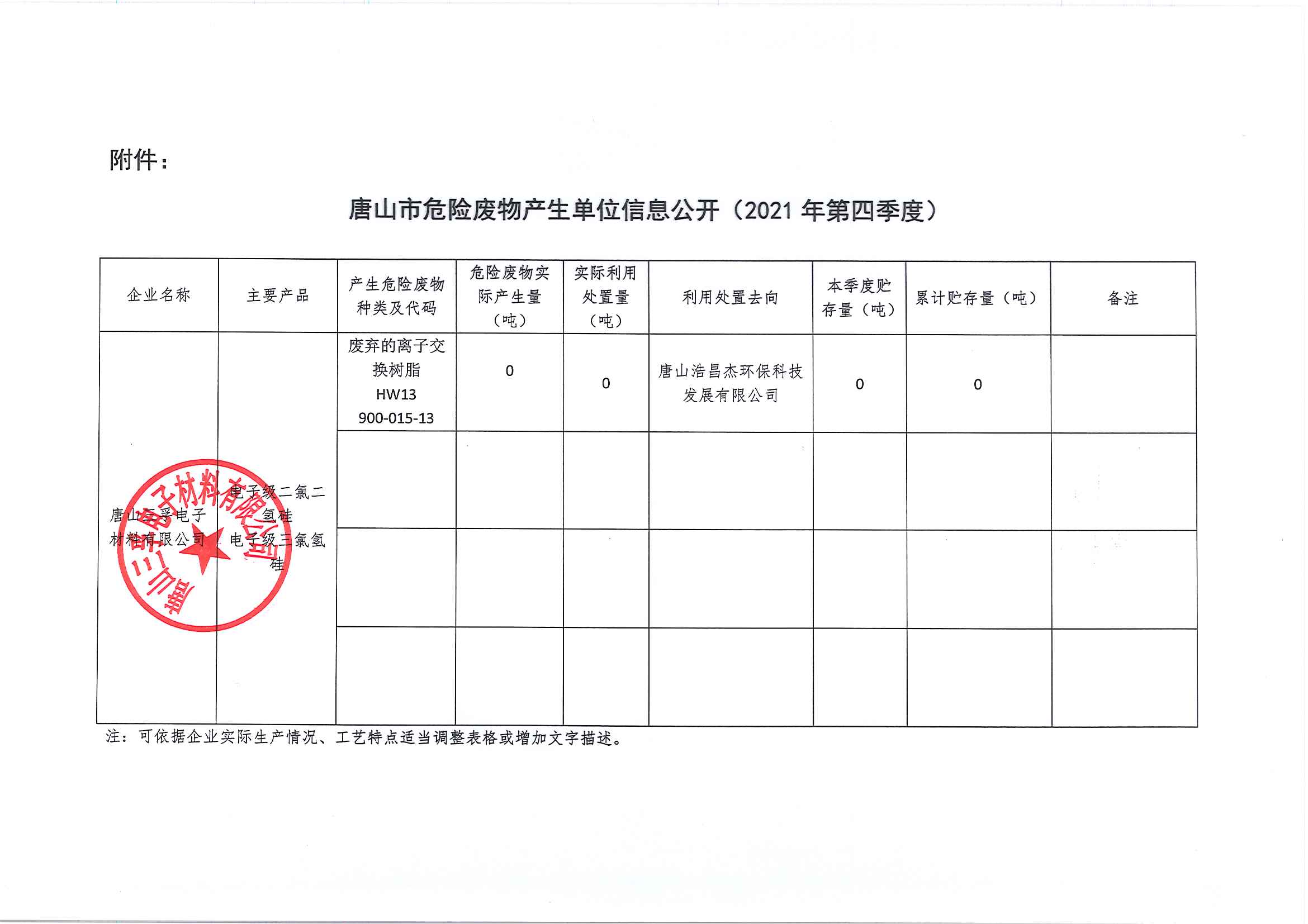 唐山三孚電子材料有限公司2021年四季度危險(xiǎn)廢物信息公開(kāi)