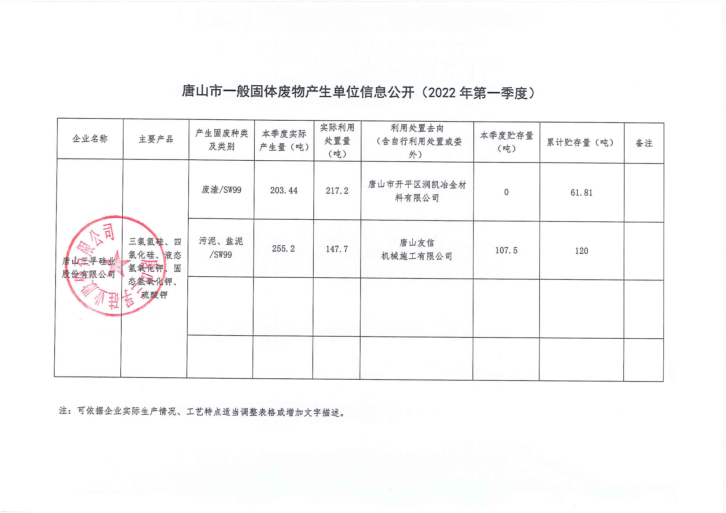 唐山三孚硅業股份有限公司2022年一季度一般固體廢物廢物信息公開