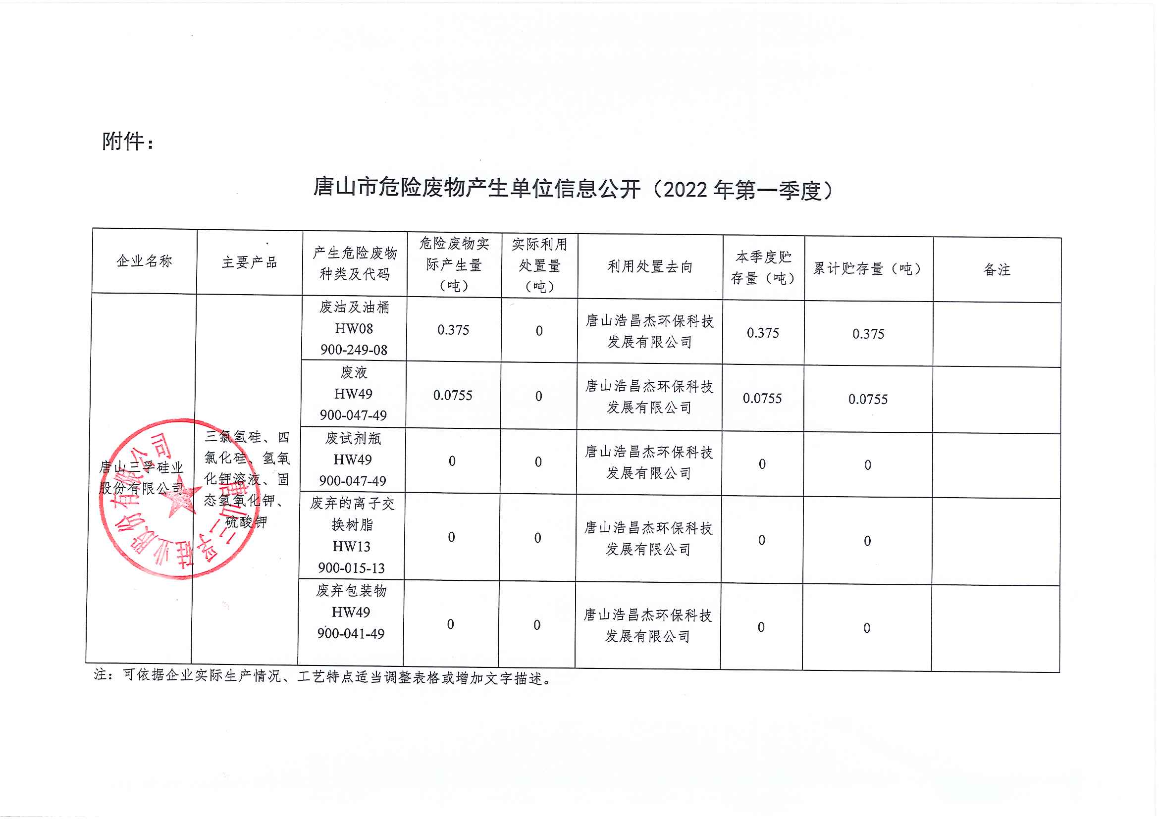 唐山三孚硅業股份有限公司2022年一季度危險廢物信息公開