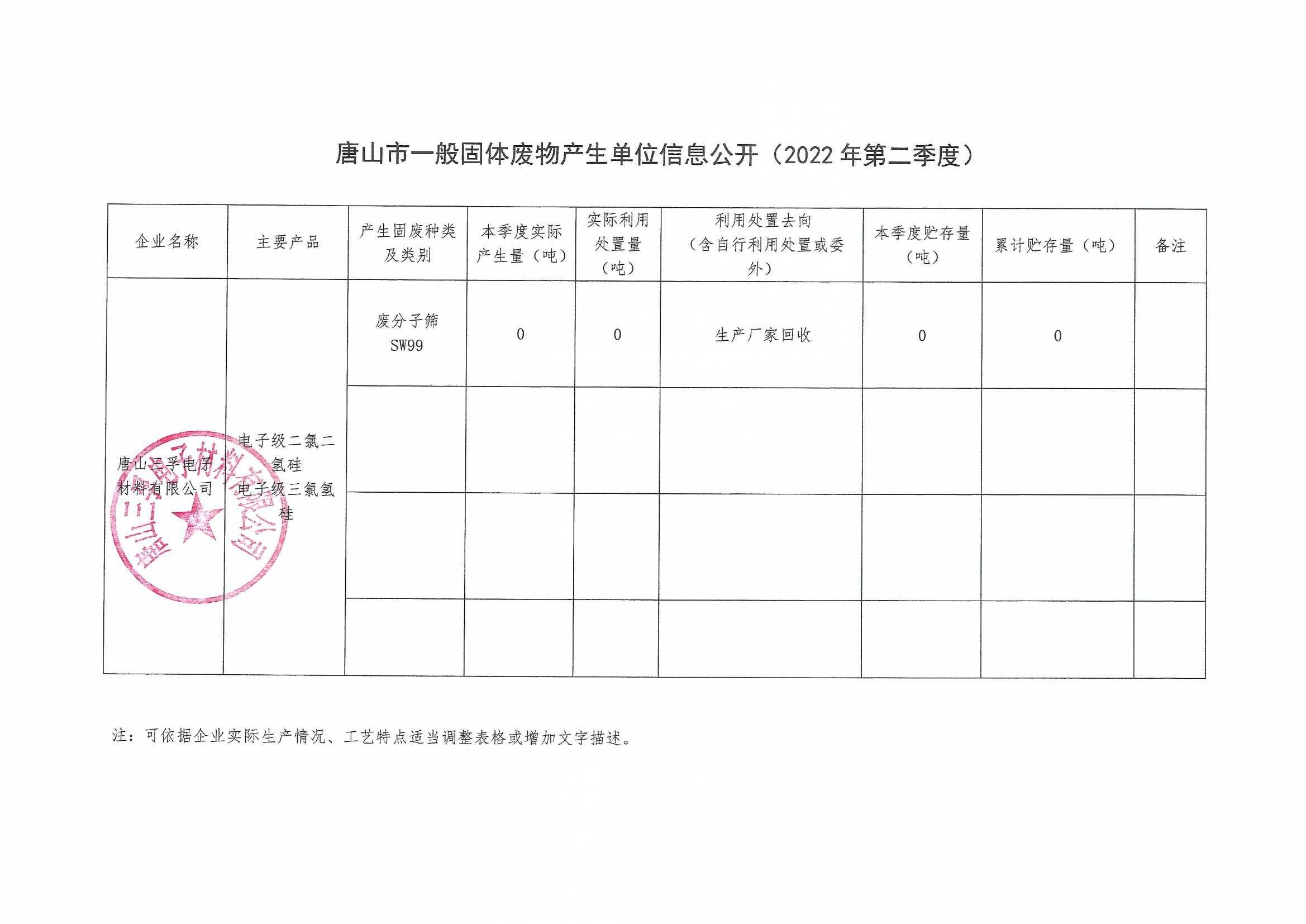 唐山三孚電子材料有限公司2022年二季度一般固體廢物廢物信息公開